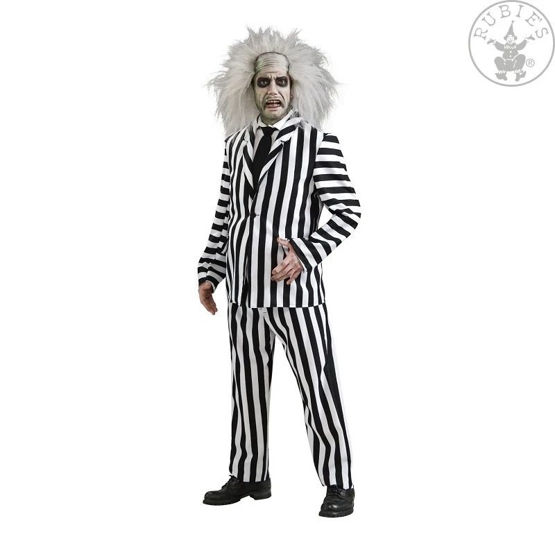 Inhoud:Â Deluxe kostuum voor volwassenen van het personage Beetlejuice uit de gelijknamige film. Het jasje en de broek zijn gemaakt van zwart wit gestreepte stof. Het mouwloze witte overhemdvoorzien van een zwarte das.