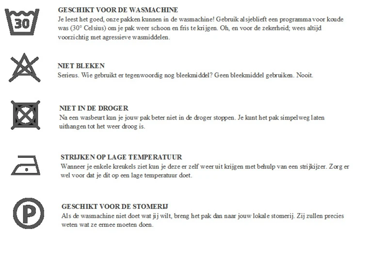 Bijzonderheden: De colberts zijn uitgerust met een binnenvoering, binnenzakken en zakken aan de voorkant. Onze pantalons hebben zakken aan de voor- én achterkant. De zakken aan de achterkant hebben zelfs knopen om ze af te sluiten